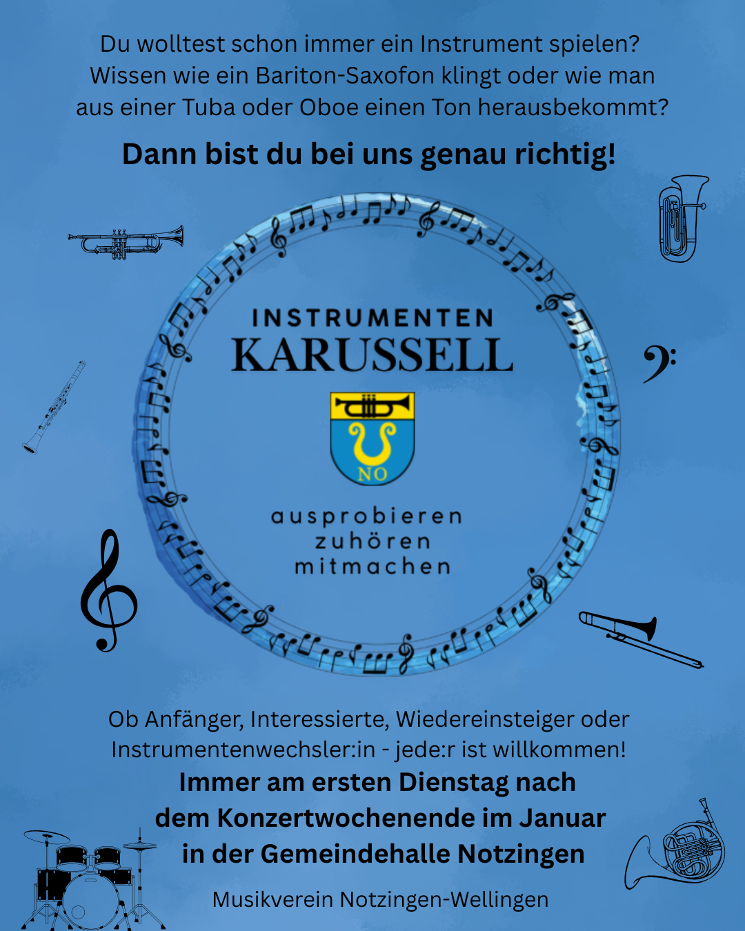Jeweils am ersten Dienstag nach dem etablierten Konzertwochenende Ende Januar findet in der Gemeindehalle Notzingen das Instrumentenkarussell statt: Bei dieser Gelegenheit können in ungezwungener Atmosphäre zahlreiche Instrumente von Piccolo und Oboe über Trompete und Klarinette bis hin zu Euphonium und Posaune ausprobiert werden.